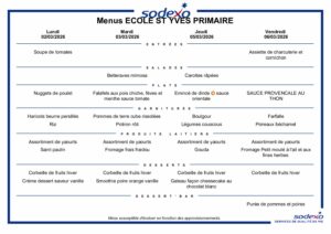 menus mars avril 2026 Ecole St Yves Elémentaires Sodexo